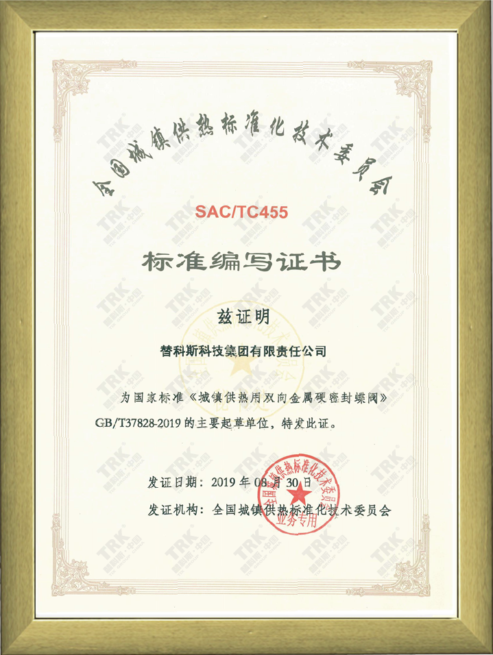 標(biāo)準(zhǔn)編寫(xiě)證書(shū)-城鎮(zhèn)供熱用雙向金屬硬密封蝶閥